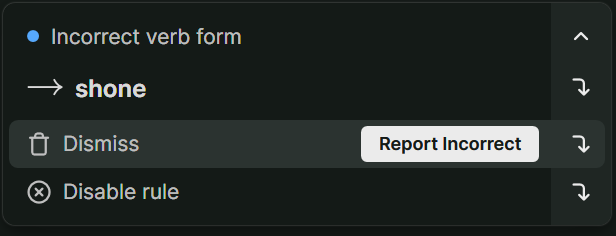 To be clear, some issues will be false positives, and that’s fine. If it doesn’t fit your voice, you can dismiss it and move on. If something looks off in the tool itself, you can report it. Hover over Dismiss, click Report Incorrect, and leave feedback. They do pay attention, and it helps improve future suggestions.